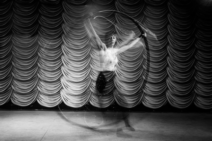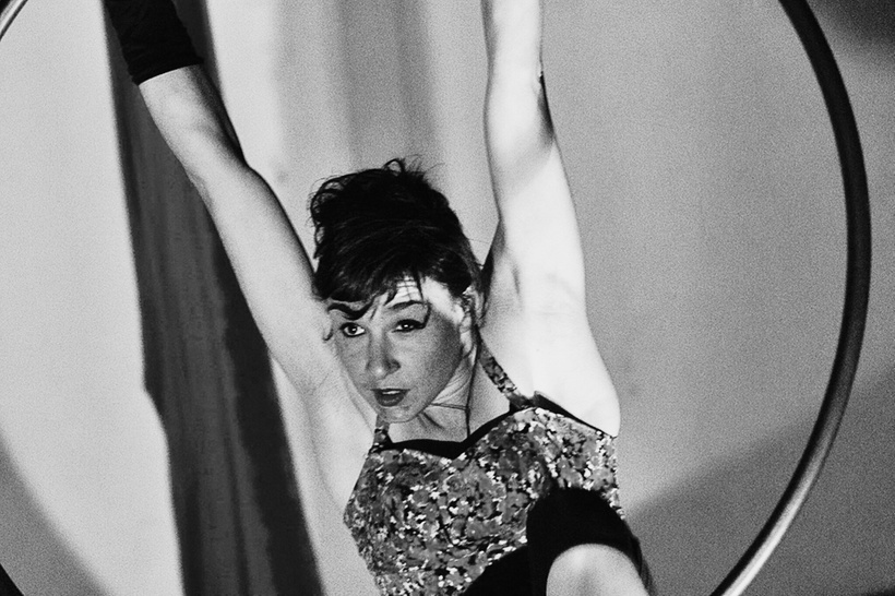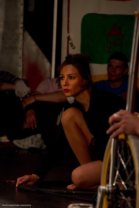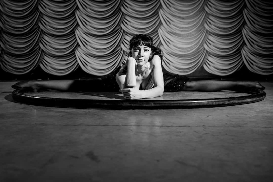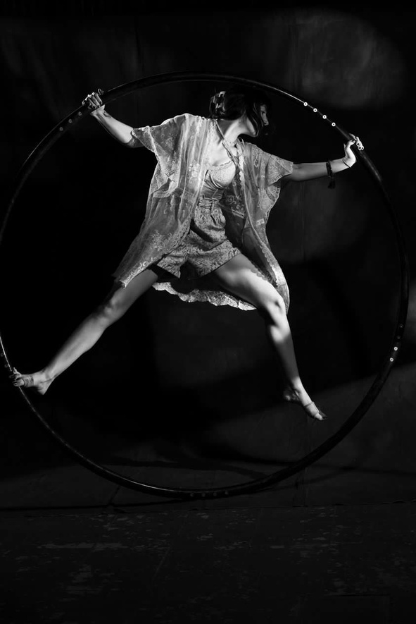 She trained at the Bordeaux Circus School where she specialized in aerial hoops (accompanied by Clémence Coconnier -Cie Meidosems-), and developed a very unique relationship with movement thanks to collaborations with Lauriane Chamming's, Karine Noël.